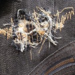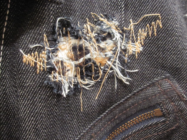 - デニムをひっさばき、裏から豹柄の生地をあてミシンで叩く。